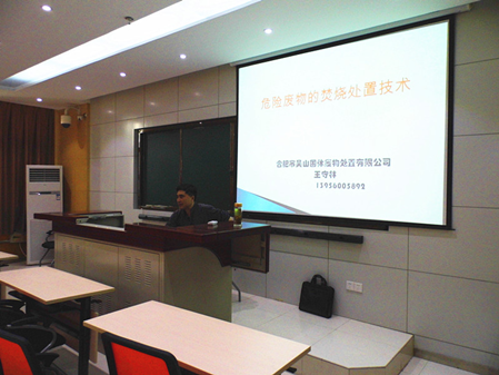 2015年4月29日上午10時,合肥市吳山固廢處置有限公司的王守林工程師圍繞危險廢物的焚燒處置技術做了一場精彩報告。王總先簡單介紹了危險廢棄物的定義和一些常規處置手段,接著著重剖析了焚燒的技術要點,包含焚燒爐的類型、技術指標和焚燒系統工藝三大模塊,最后就焚燒產生的劇毒物質二噁英的控制方式向我們進行了詳細的介紹。我院環境工程專業研究生以固廢為主要的研究方向,王總的講座對于學生們豐富課外知識和了解固廢的處置工藝有很大的幫助。下周同學們還將去吳山固廢處置公司現場實地學習。實地考察學習環節是我校專業碩士培養的一大亮點。