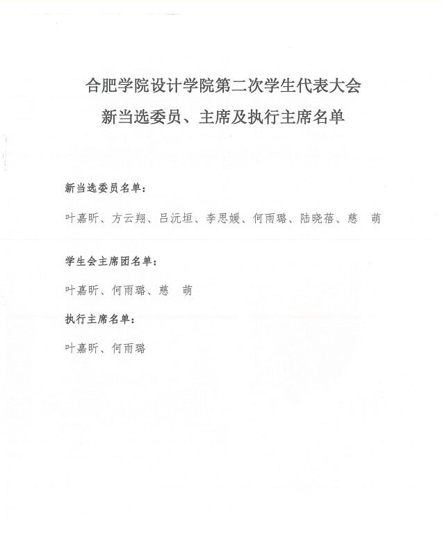合肥學院設計學院第二次學生代表大會新當選委員、主席及執行主席名單