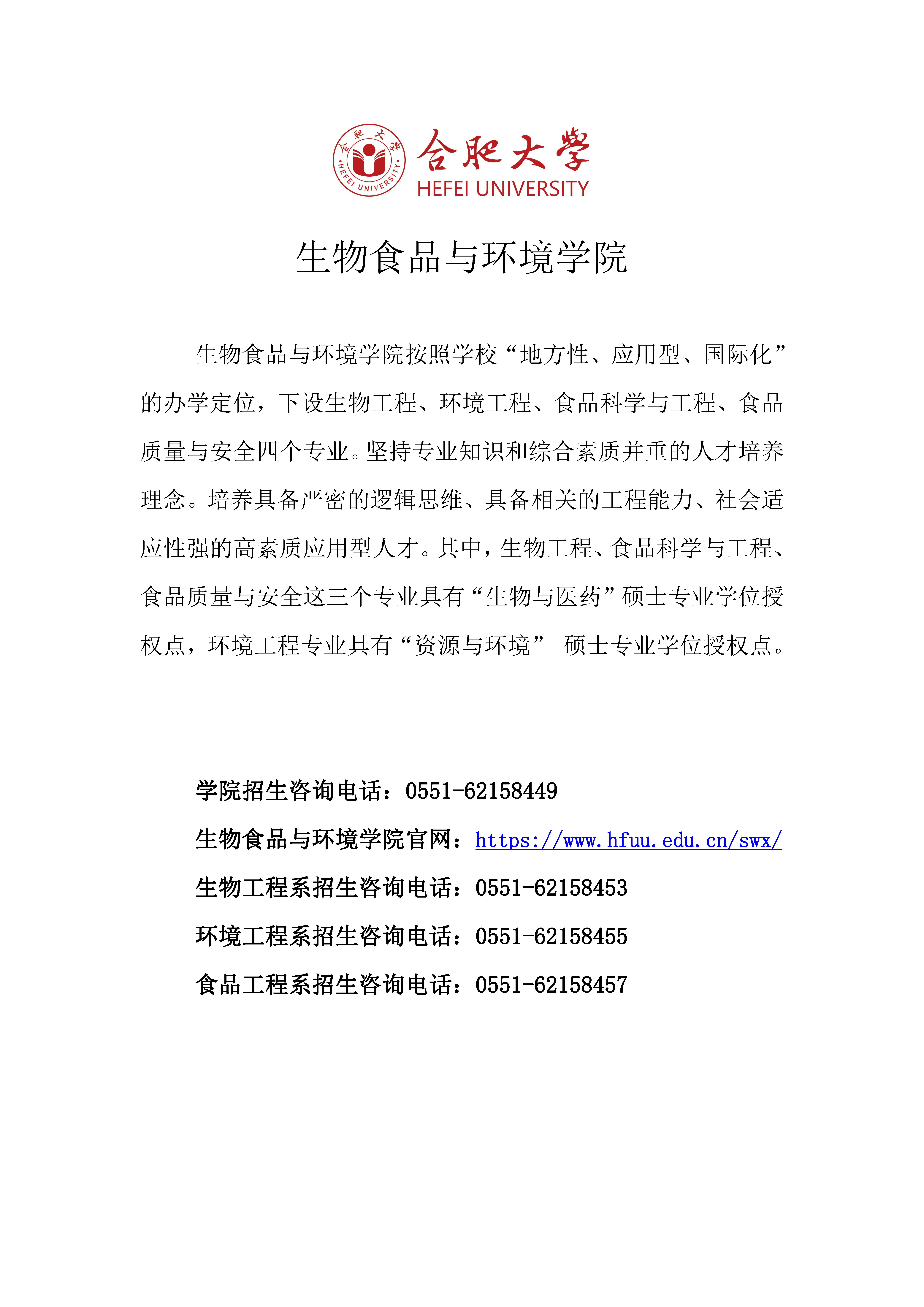 生物食品與環境學院現有生物工程、環境工程、食品科學與工程和生物制藥四個本科專業,在崗教職工71人,擁有37個專業實驗室、8個公共實驗室,建有安徽省固體廢棄物能源化利用工程技術研究中心、安徽省生物增材制造重點實驗室等8個省級科研平臺。學院按照學校“地方性、應用型、國際化”的辦學定位,堅持專業知識和綜合素質并重的人才培養理念。在人才培養過程中,強調理論與實踐相結合,注重提升工程應用能力和創新意識。培養具備嚴密的邏輯思維、具備相關的工程能力、社會適應性強的高素質應用型人才。近五年學院學生獲省市級以上獎項211項,其中獲國家級獎項34項,首獲第十二屆“挑戰杯”大學生創業計劃賽金獎,是我校首次榮獲“挑戰杯”國家金獎,實現歷史性突破。學院全力推動高質量就業,多年來畢業生就業率在95%以上,考研錄取率常年穩定在30%以上。