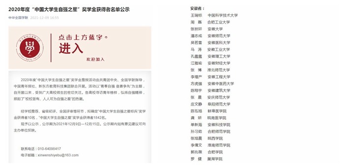 自本年度尋訪“中國大學生自強之星”活動啟動以來,校團委在全校范圍積極動員,認真組織遴選和申報工作,最終經校團委推薦、省級初評、全國評審等環節,郭兆薇同學成功脫穎而出,成為我校新時代引領青年大學生自強不息、奮勇拼搏的好榜樣。