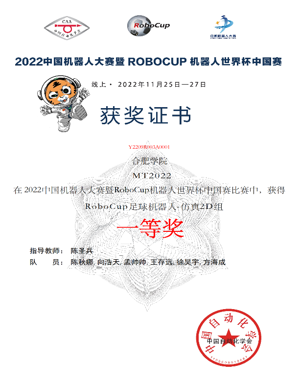 本次大賽吸引了國內(nèi)220所高校的843支隊(duì)伍、共4500多人參加,比賽項(xiàng)目分為足球類人組、仿真組、救援組等17個(gè)項(xiàng)目。我校人工智能與大數(shù)據(jù)學(xué)院的陳秋娜、向浩天、孟帥帥、方海成、王存遠(yuǎn)、徐昊宇組成的MT2022球隊(duì)在陳圣兵教授的帶領(lǐng)下,與來自南京大學(xué)、中南大學(xué)、東北大學(xué)、合肥工業(yè)大學(xué)和安徽工業(yè)大學(xué)等多所國內(nèi)知名機(jī)器人球隊(duì)同臺(tái)競技,隊(duì)員們針對對手攻防特點(diǎn)不斷改進(jìn)策略、優(yōu)化動(dòng)作,最終獲得仿真2D項(xiàng)目組冠軍。