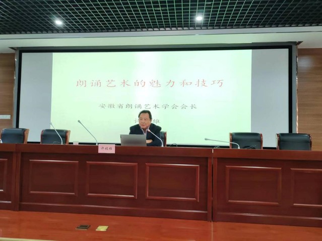 許北雄教授曾任安徽演藝集團藝術總監(jiān),安徽省徽京劇院院長,安徽省話劇團副團長,現(xiàn)為安徽朗誦藝術學會會長,是安徽省話劇表演、播音主持、朗誦藝術等領域領軍人物和代表人物,曾獲安徽省播音主持一等獎、安徽省藝術節(jié)表演一等獎等諸多獎項。講座開始后,許教授從個人經(jīng)歷、作品展示、經(jīng)驗分享、朗誦技巧等方面向大家多角度、全方位地介紹了朗誦這門語言藝術,深入淺出地告訴同學們朗誦前應做何種準備工作、如何充分把握作品內容、怎樣用聲音充分演繹出作品的內涵以及怎樣塑造鮮活的人物形象,并重點傳授了朗誦的表現(xiàn)手段和基本方法,令人受益匪淺。