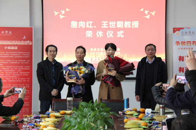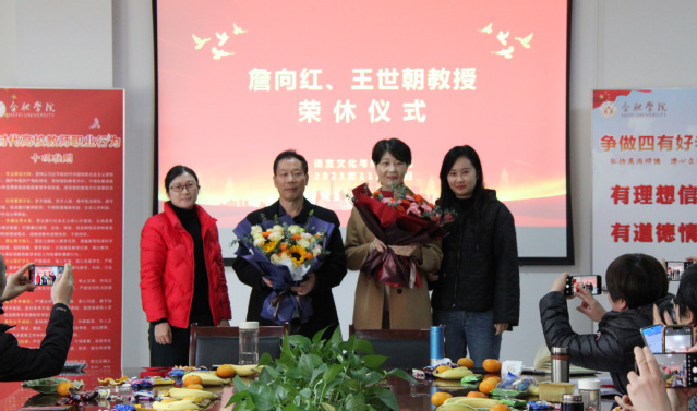 11月14日下午,語言文化與傳媒學院在一期五棟二樓大會議室舉行了2023年教職工榮休儀式,向2023年榮休的詹向紅、王世朝兩位教授表示感謝與祝福。學院領導班子成員、全體教職工參加儀式。