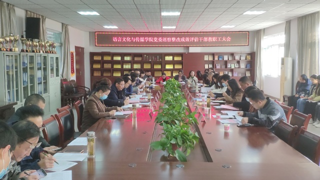 11月16日上午,語言文化與傳媒學(xué)院在學(xué)院大會議室召開巡察整改成效評估干部教職工大會,校黨委巡察辦主任、專項(xiàng)檢查組組長宋執(zhí)蕓,專項(xiàng)檢查組成員吳孔寶、孫靜宇、王晴、張雪、袁園、王順等蒞臨指導(dǎo),會議由院黨委書記儲昭輝主持,學(xué)院全體教職工及學(xué)生代表參加會議。
