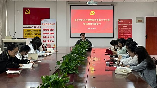 為深入學習貫徹好新修訂的《中國共產黨紀律處分條例》,進一步加強黨的紀律作風建設,增強黨員紀律規矩意識,語言文化與傳媒學院學生第二黨支部于4月28日晚在二樓會議室開展專題學習,會議由黨支部書記柳守志主持,全體黨員同志參加。