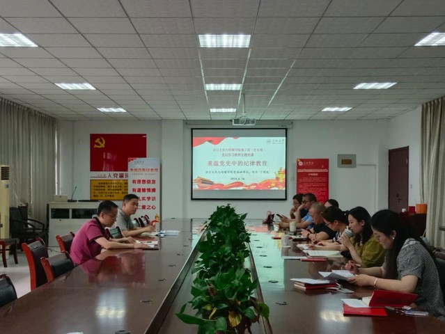 618日下午,語言文化與傳媒學院教工第一黨支部在學院大會議室舉行了黨紀學習教育專題黨課。此次黨課題為“重溫黨史中的紀律教育”,由院長丁增武主講,教工第一黨支部全體黨員參加。